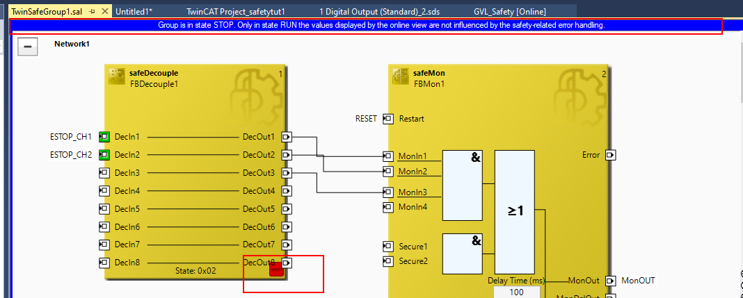 But the Safety Group is in stop state, and also there is a red icon in all your Safety Function Block.