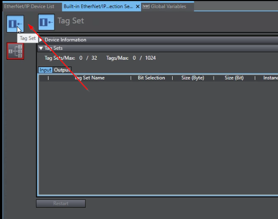 Go back to the Ethernet/IP Settings screen and click on the “Tag set” button at the top to register the variables defined in the Global Variables for Ethernet/IP tag communication.