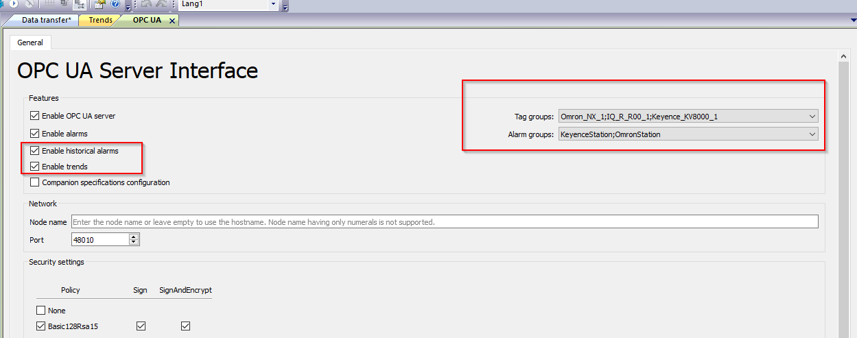 And for Tags Groups and Alarms Groups, select the Groups you want to apply to OPC UA Historical (that’s why you defined Groups earlier, many features in EXOR’s JMobile Runtime are also managed in Groups).