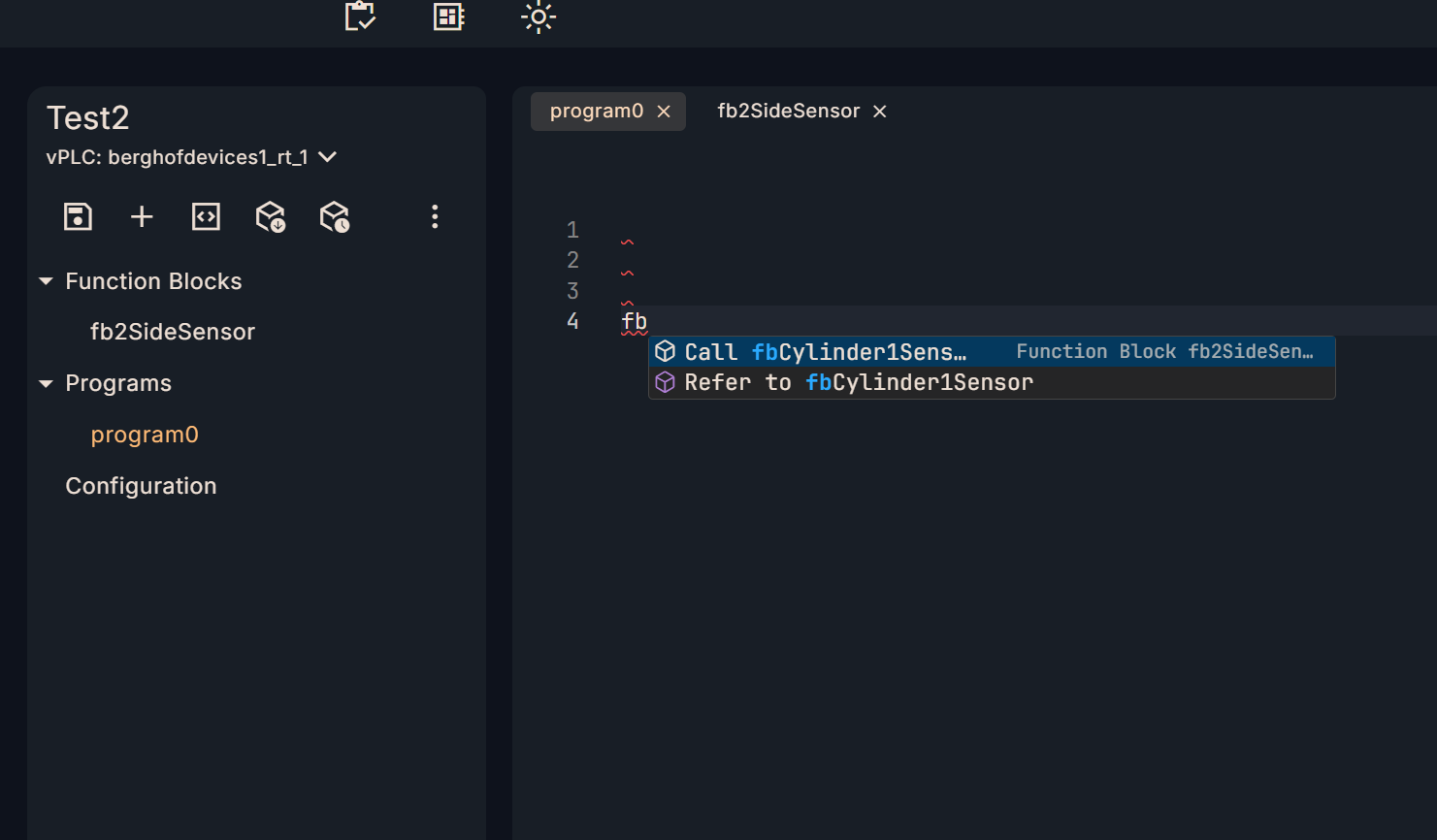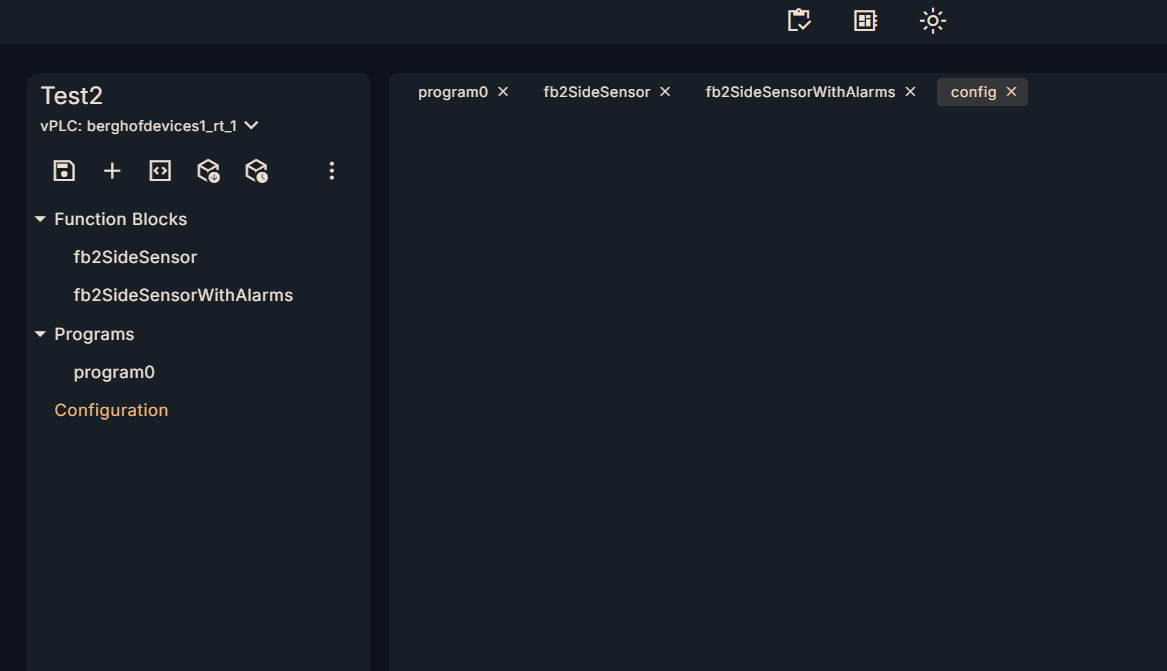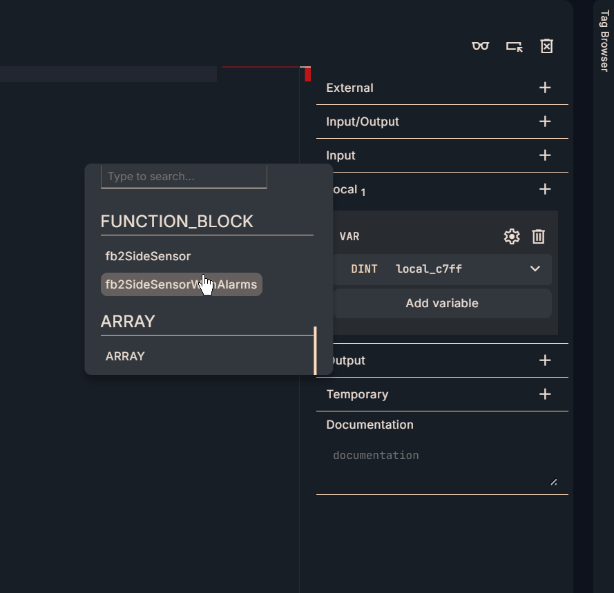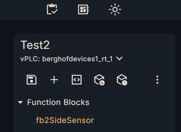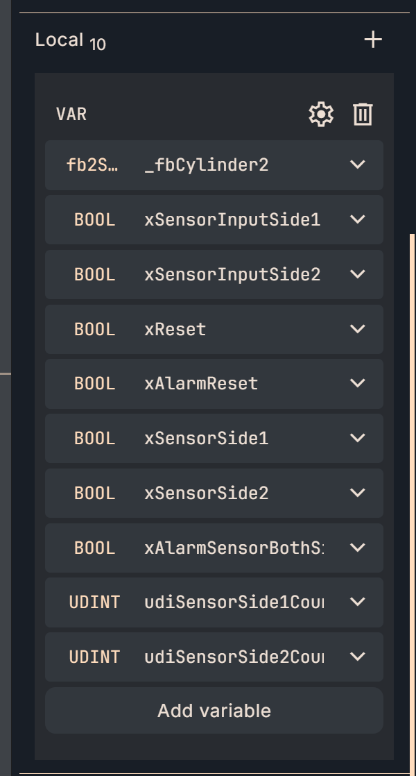 The last program is the MAIN program. Declare the fb2SideSensorAlarms defined earlier as a Local variable.