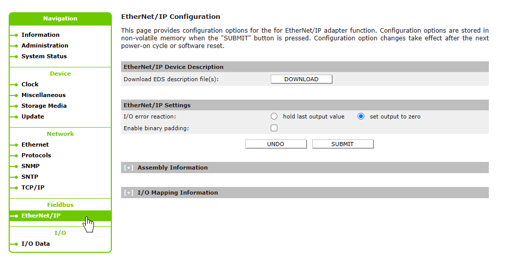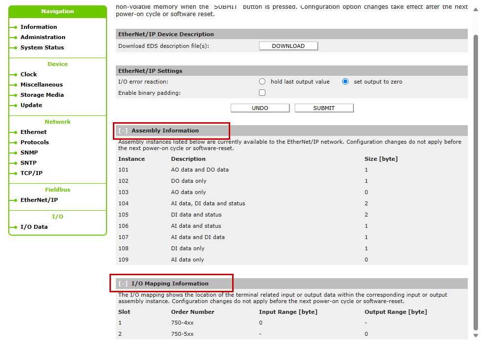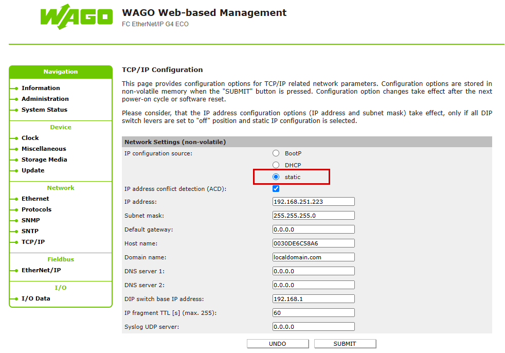 Next, verify the Ethernet/IP settings for the WAGO Ethernet/IP coupler. Click Fieldbus → Ethernet/IP.