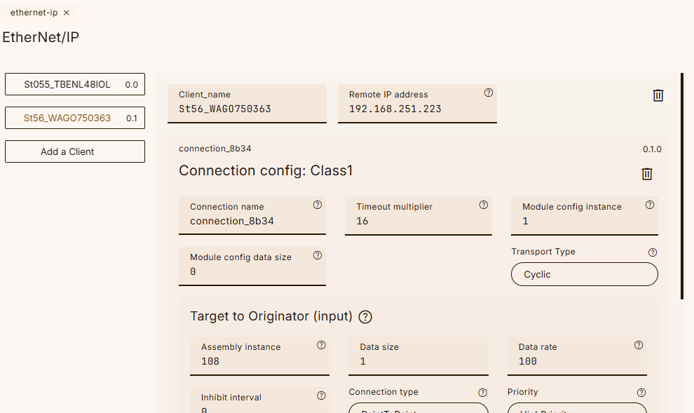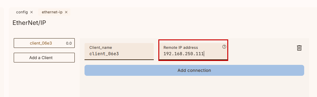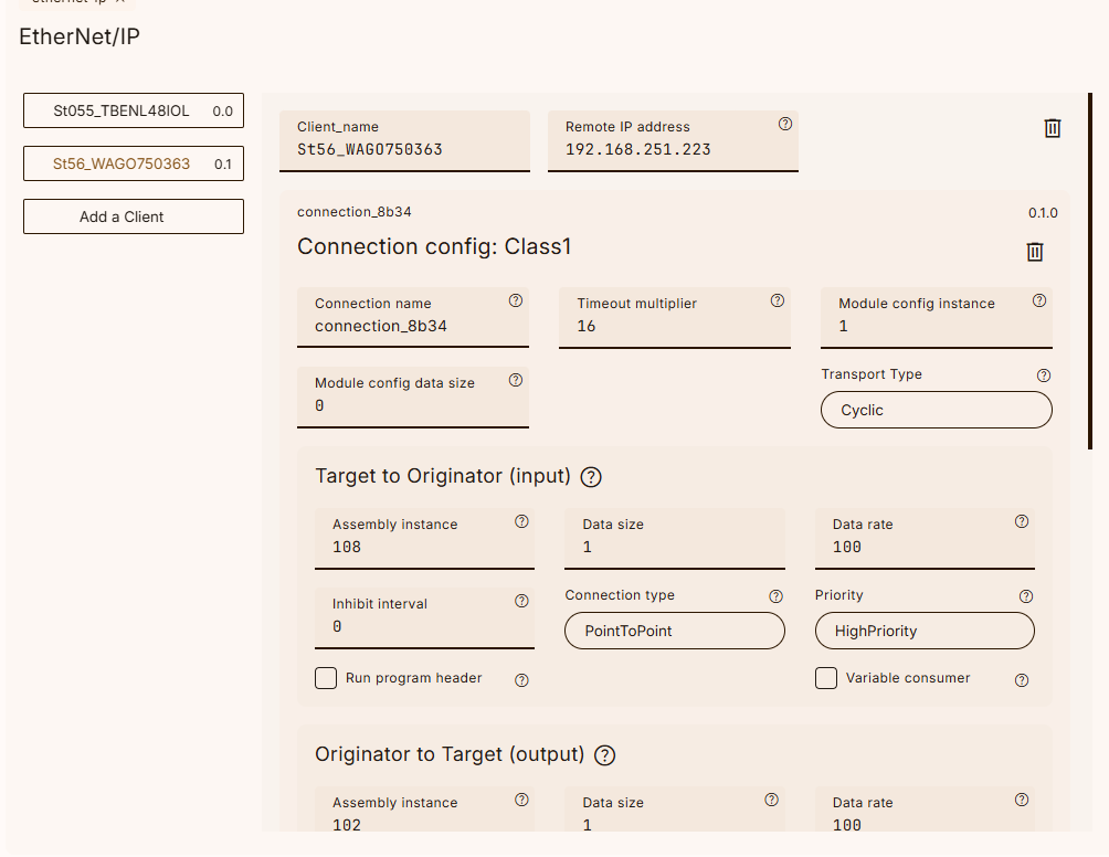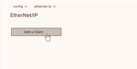 Next, open the Ethernet/IP settings screen and add a new Ethernet/IP Adapter by selecting “Add a Client”.
