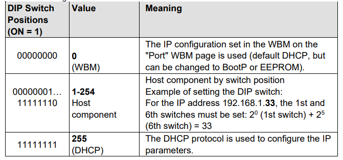 Additionally, the DIP switches can be used to configure the final byte of the IP address and for IP address assignment (DHCP, BootP, static).