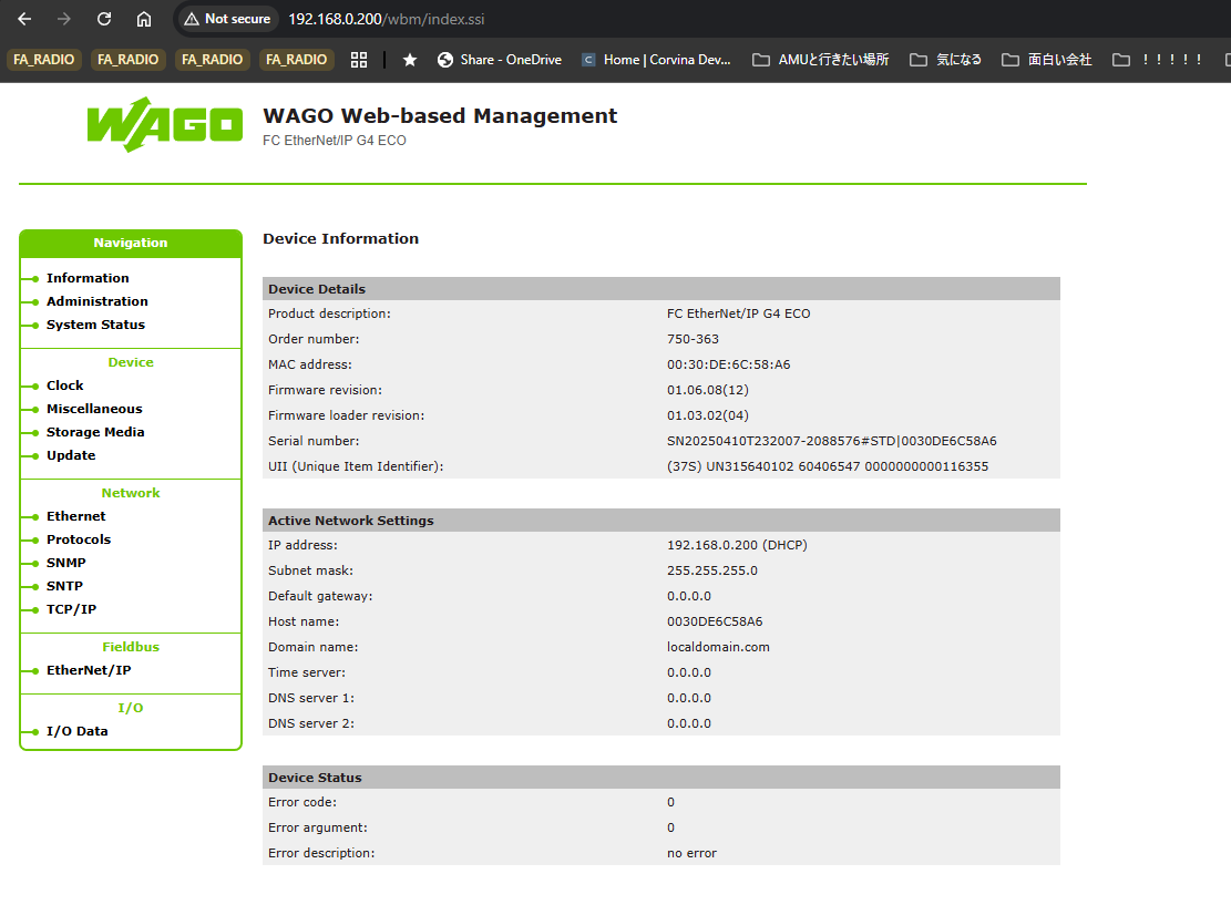 First, set a fixed IP address via the DIP switches, then access the web server on the WAGO Ethernet/IP coupler 750-363.