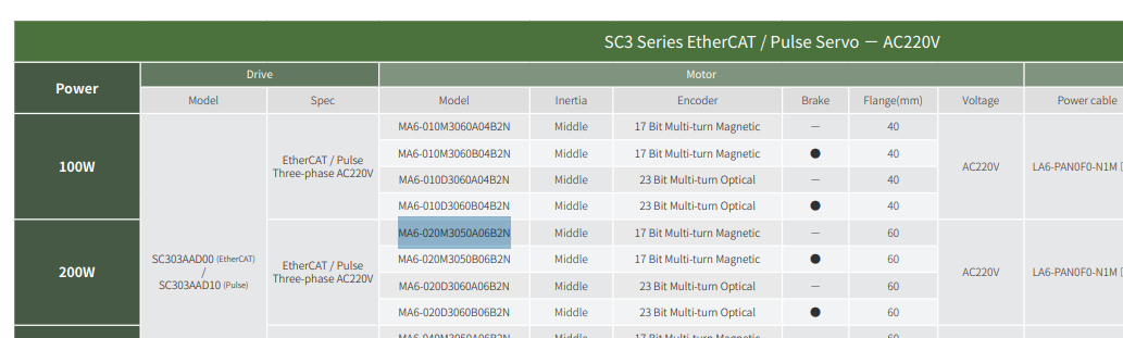 The SERVO used in this article is the MA6-020M3050A06B2N, a 220V model equipped with a 17-bit encoder.
