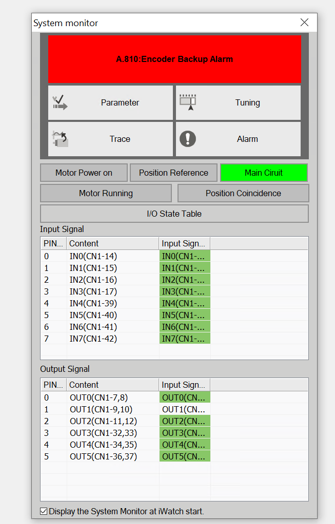 This allows you to check the current status of SERVO alarms, I/O terminals, and other components.
