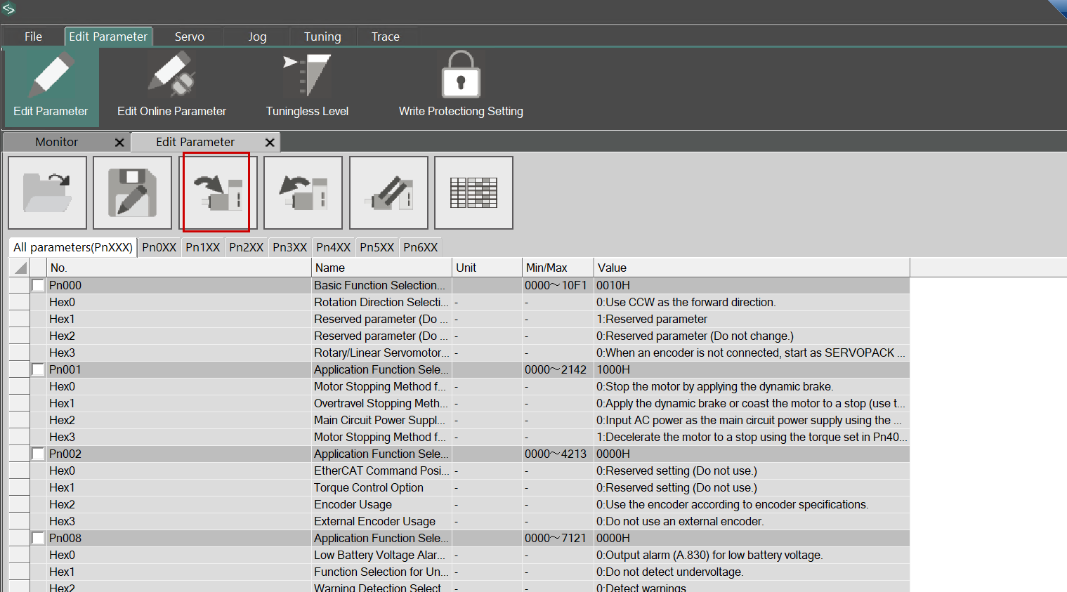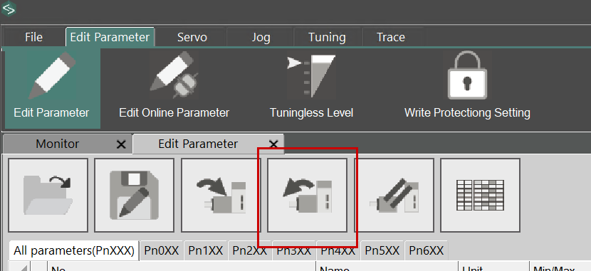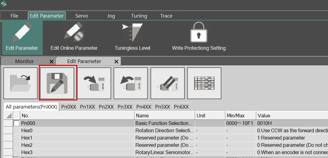 Next, use the button shown below to write the parameters to the SERVO DRIVE.