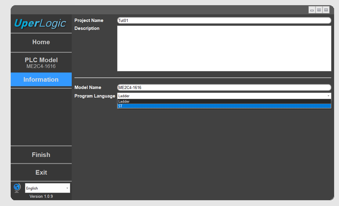 Additionally, you can create programs in either Ladder or ST by selecting from the Program Language drop-down box.