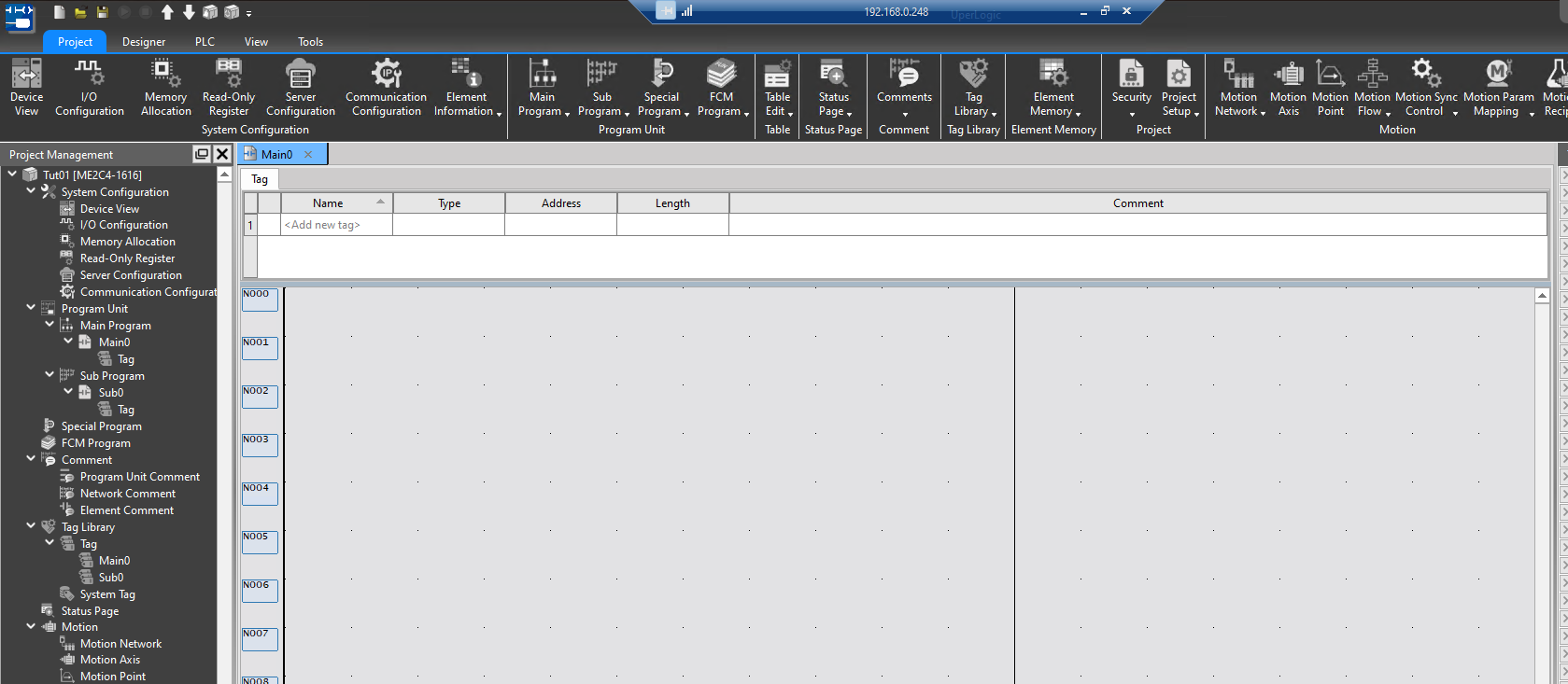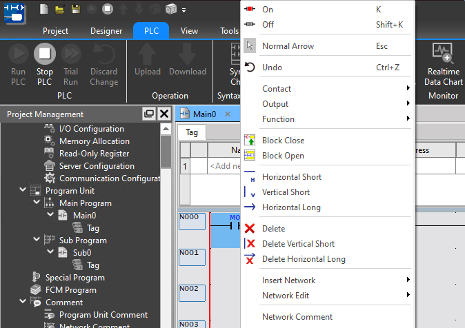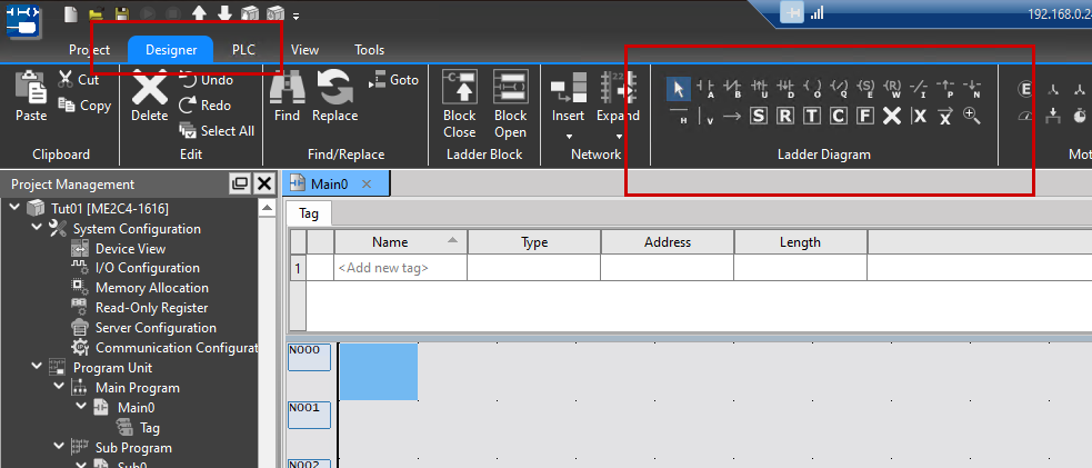 Now let’s create our first ladder program. Open the Designer Tab and add each ladder component from the Ladder Diagram.