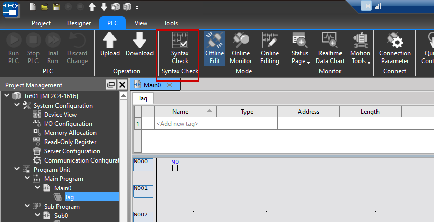 Finally, go to PLC → Syntax Check to check the program for errors.