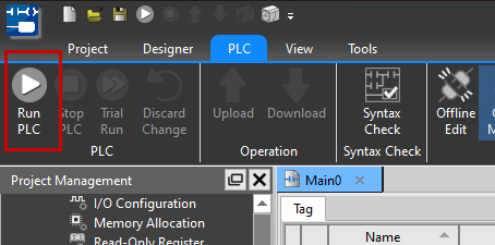 Click [PLC] → [Trial Run] on the function bar to perform a trial run of the PLC.