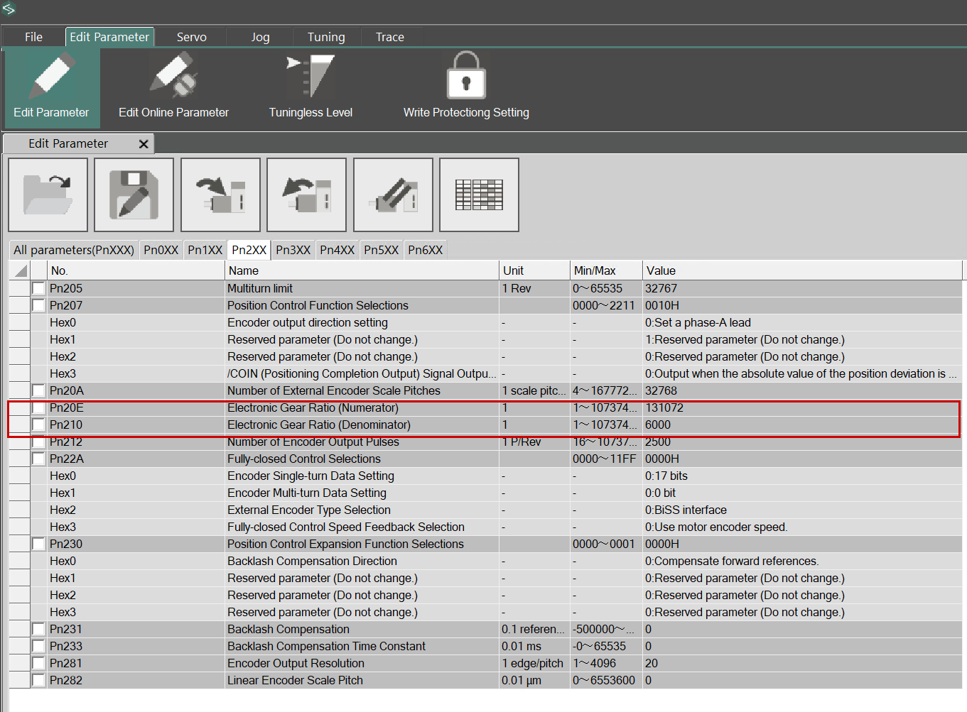 This time, we will set Pn210 with Pn20E=131072. The servo motor used in the article has a resolution of 17 bits, and one revolution is set to 6000 (unit: mm).