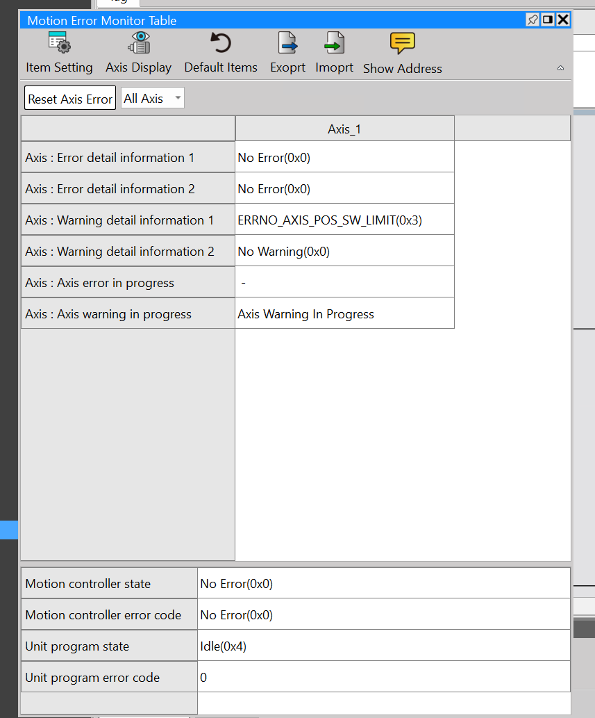To check the error status of the axes, click Motion → Motion Network → Motion Error Table.