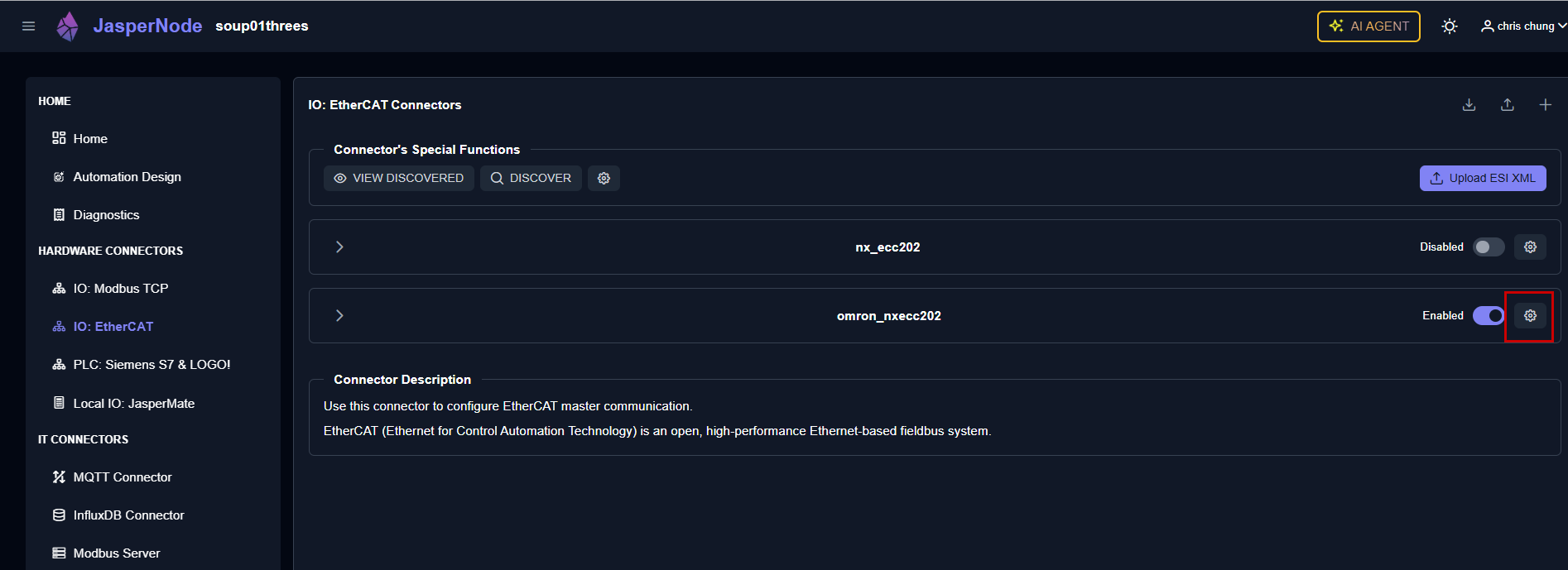 The EtherCAT connection generated earlier by the JasperNode AI AGENT is displayed.