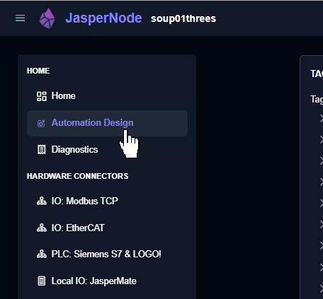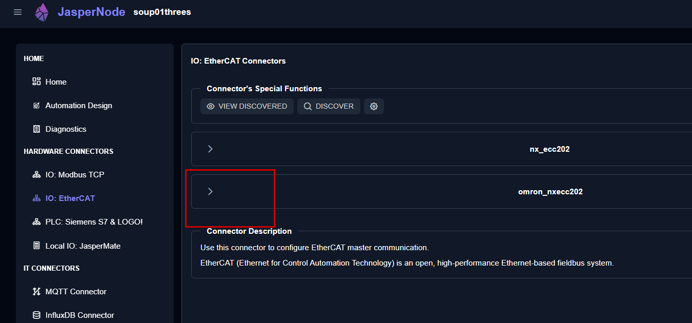 Next, click HARDWARE CONNECTORS → IO EtherCAT on the left side of JasperNode.