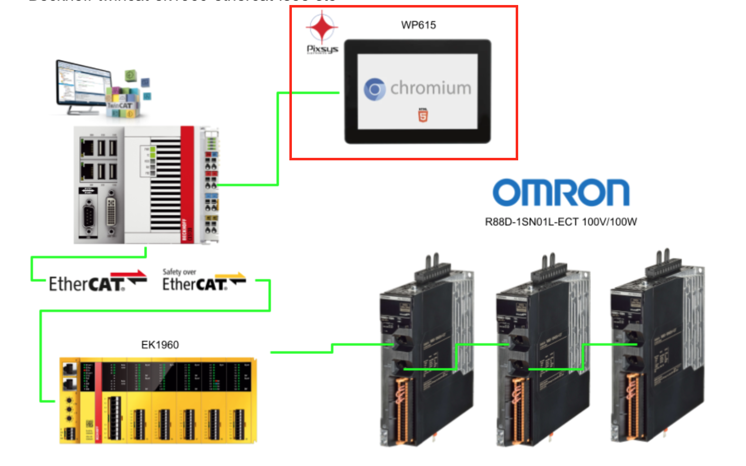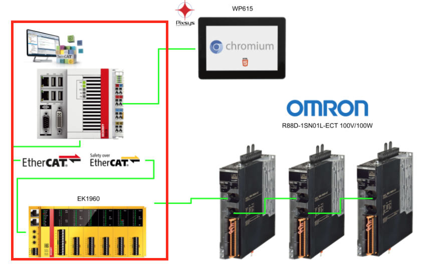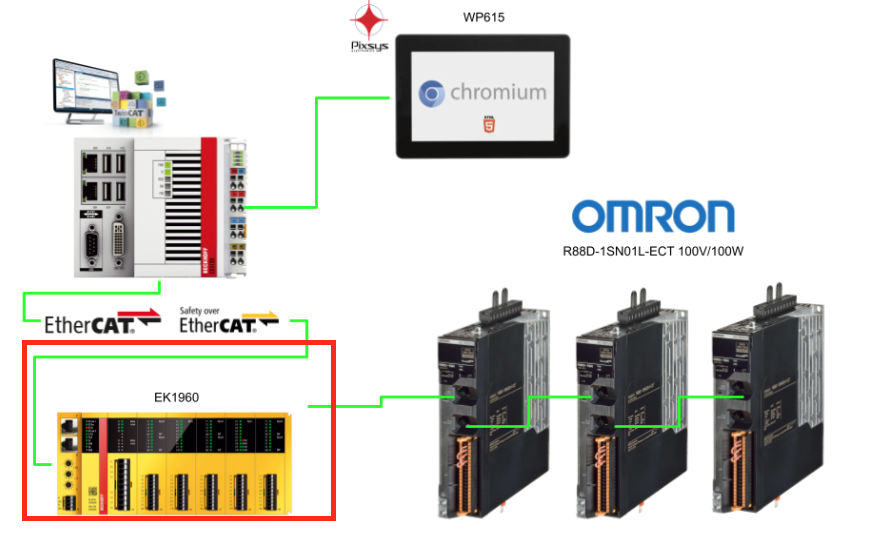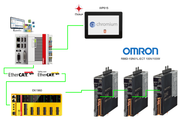 This article explains how to receive and control the STO signal of an OMRON R88D FSoE servo using FSoE communication via EtherCAT in a Beckhoff TwinCAT + EK1960 (TwinSAFE) configuration. It covers configuring safety function blocks (FBEstop / FBDecouple etc.) in the TwinSAFE Editor, maintaining state using TwinCAT ST structures, implementing STO signal trigger processing in the MAIN program, and includes an example of HMI screen integration.