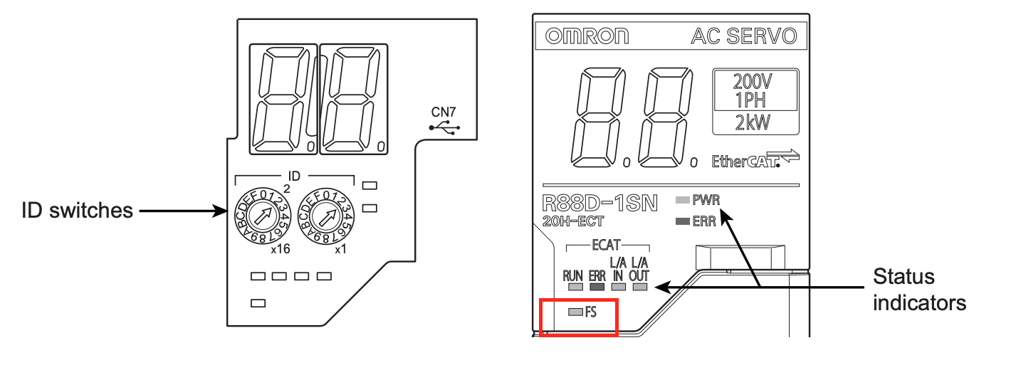 The bottom of the OMRON R88D-1SN series servo drive features an “FS” (FSoE Status) indicator, allowing you to check the FSoE communication status and errors at a glance.