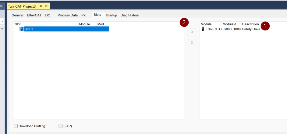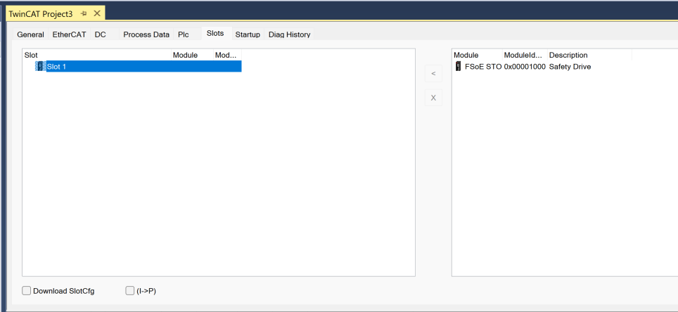 To configure the OMRON FSoE-STO slot in TwinCAT, select FSoE STO 0x00001000 Safety Drive, click the “<” button in the center to add to Slot, and it will be registered as “Slot 1” in the slot list on the left side.