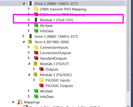 The FSoE STO module for the OMRON 1S servo has been added to the TwinCAT project.