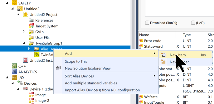 To reference and control FSoE slave devices such as OMRON servos from within TwinSAFE logic, they must first be registered as Alias Devices. This can be done by right-clicking on “Alias Devices” in the TwinSAFE project and selecting “Add” → “New Item…”.