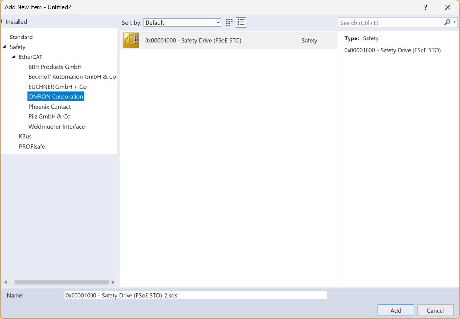 When creating a new Alias Device in a TwinSAFE project, selecting “Safety > EtherCAT > OMRON Corporation” displays the module “0x00001000 – Safety Drive (FSoE STO)” in the list. By selecting this and pressing the Add button, an Alias Device is created that allows the OMRON STO slave to be controlled within TwinSAFE.