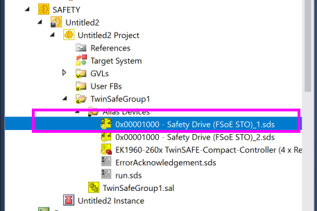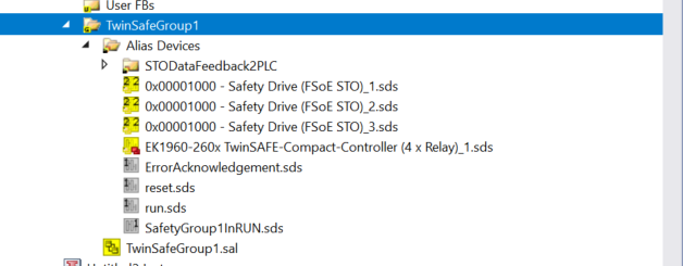 This screen confirms that the .sds file for 0x00001000 – Safety Drive (FSoE STO) has been properly added to “Alias Devices” within the TwinSAFE project.