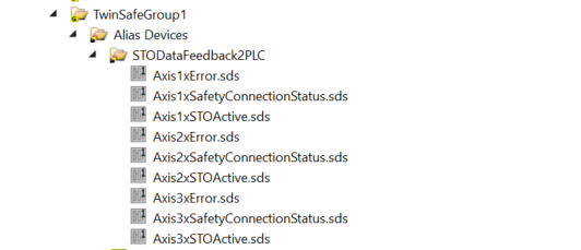 Within the TwinSafeGroup1 project, create “STODataFeedback2PLC” as a virtual alias folder to return the STO status and error information of each axis (Axis1~3) to the PLC.