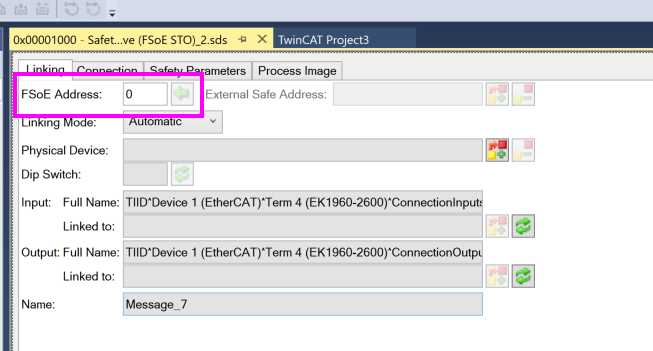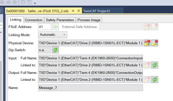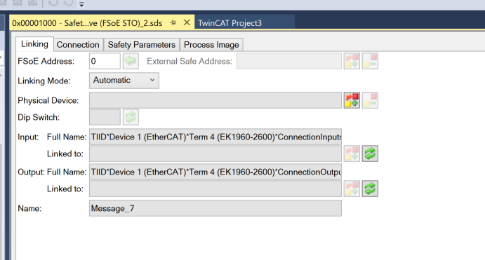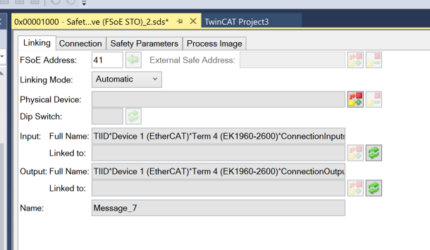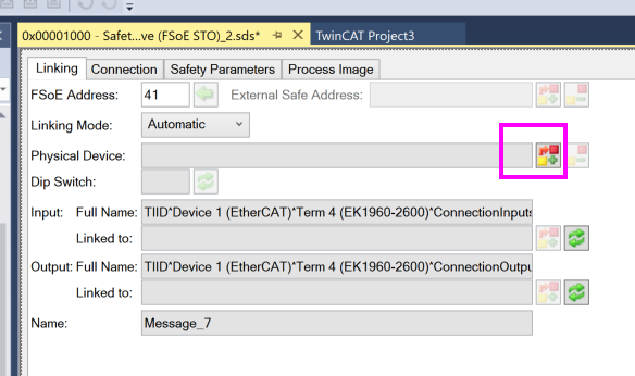 In TwinCAT, link the physical device (= actual EtherCAT slave) to the Safety Device (FSoE STO).