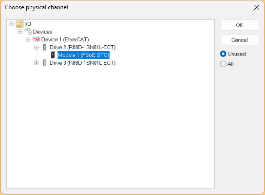 A window titled “Choose physical channel” appears, so expand the corresponding Drive in the EtherCAT configuration, select “Module 1 (FSoE STO)” within it, and press “OK”. This correctly associates the software STO configuration with the physical FSoE output module.
