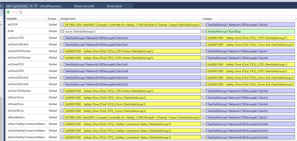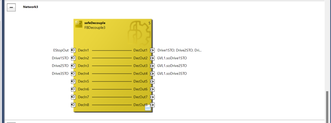 This is a network for controlling and distributing the STO signals (Safe Torque Off) for three axes when an emergency stop (E-Stop) occurs. Starting from EStopOut, it is configured to collectively cut off STO control for each drive, with output signals mapped to GVL1 variables respectively.