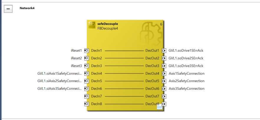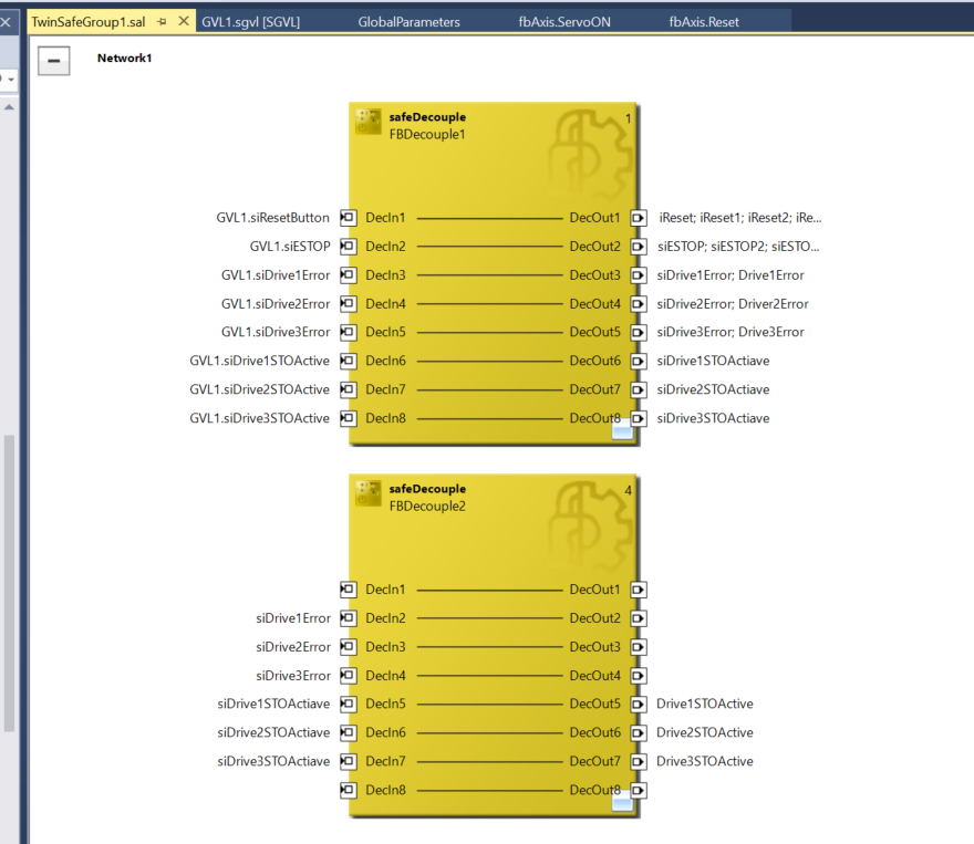 This screen shows the network connection screen for TwinSAFE’s safeDecouple blocks (FBDecouple1, FBDecouple2).