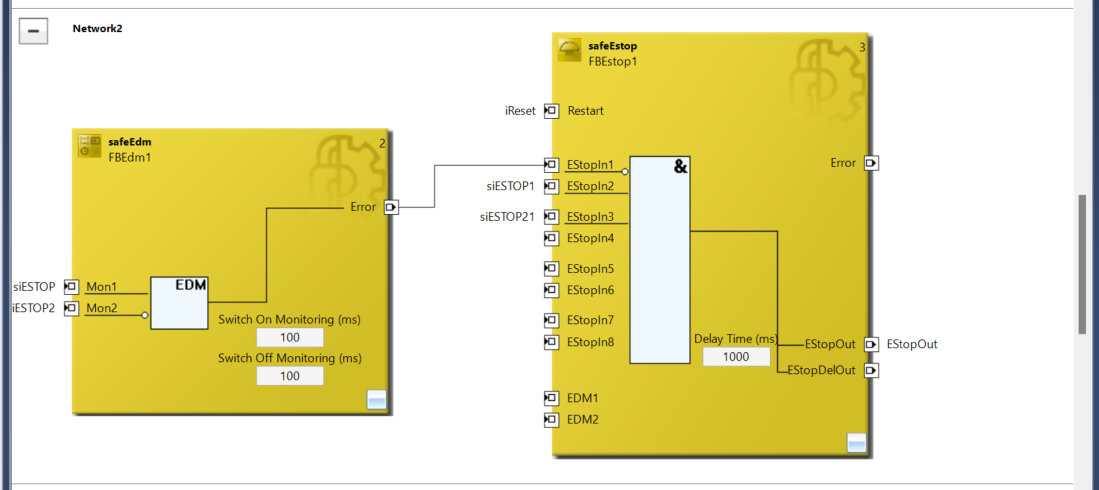 - When conditions are met, turn EStopOut ON immediately and EStopDelOut ON after 1 second.