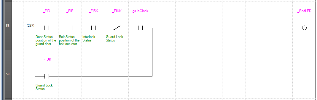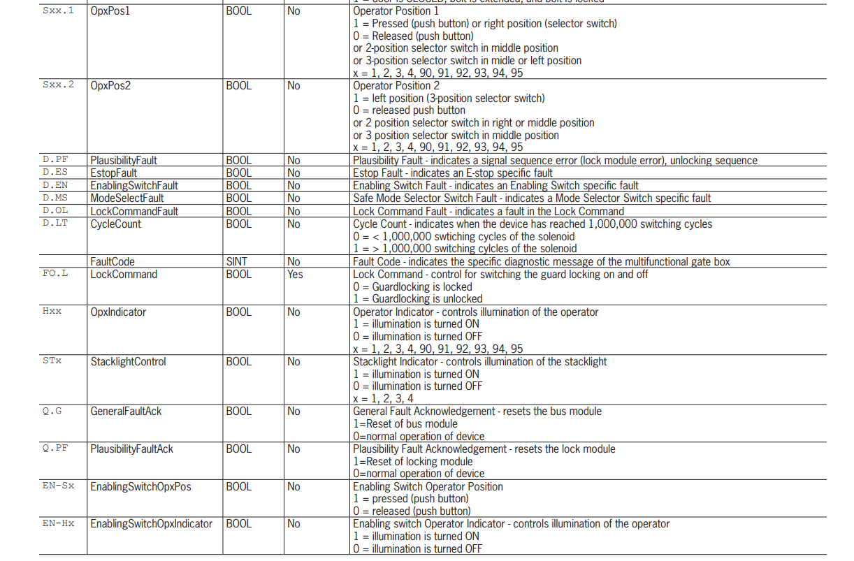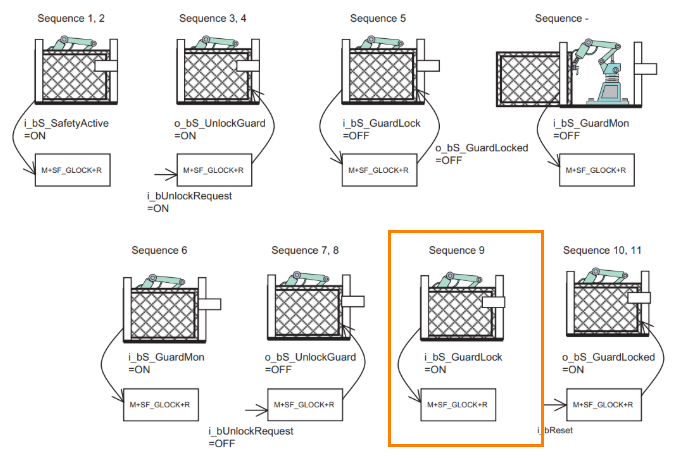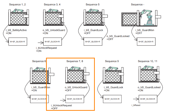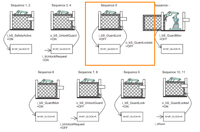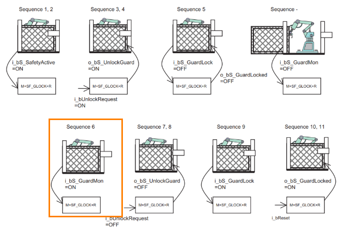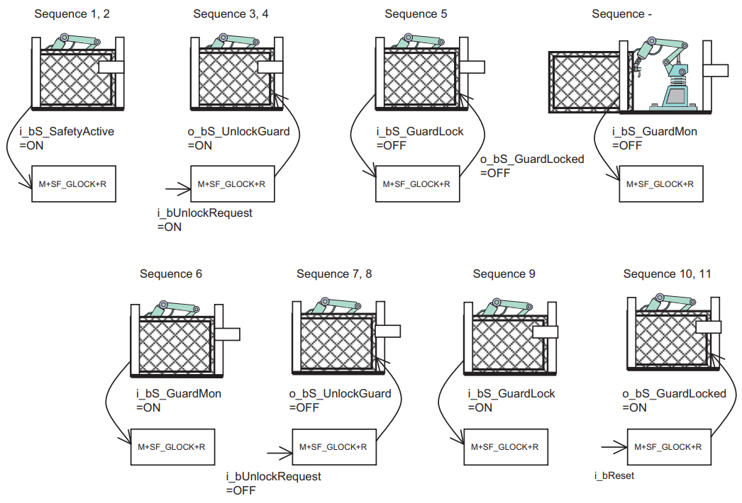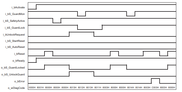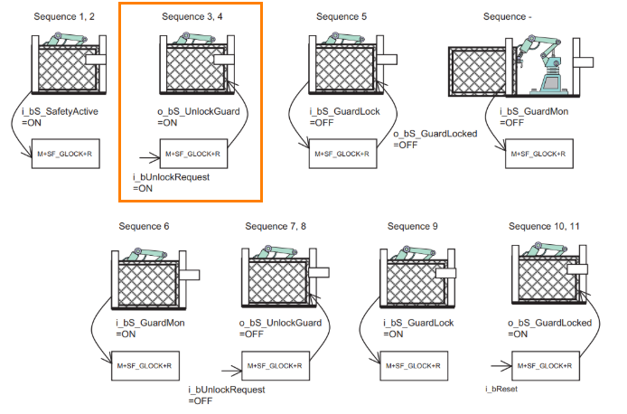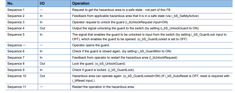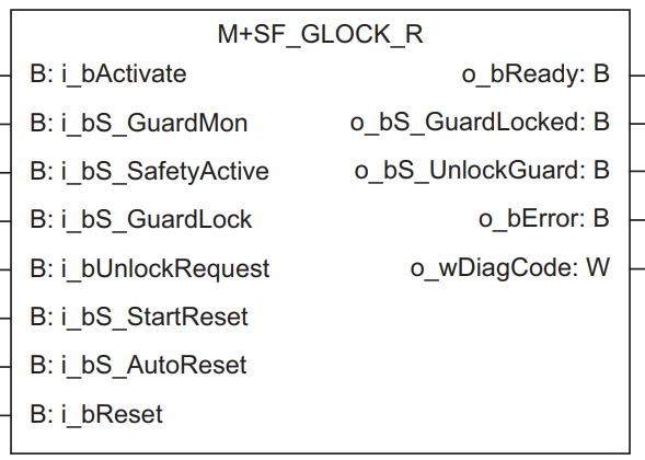 This is a function block that controls the guard lock and monitors its position. This function block can be used in conjunction with a mechanical lock switch, allowing the operator to request access to the hazardous area. The guard lock can only be released when the hazardous area is in a safe state.