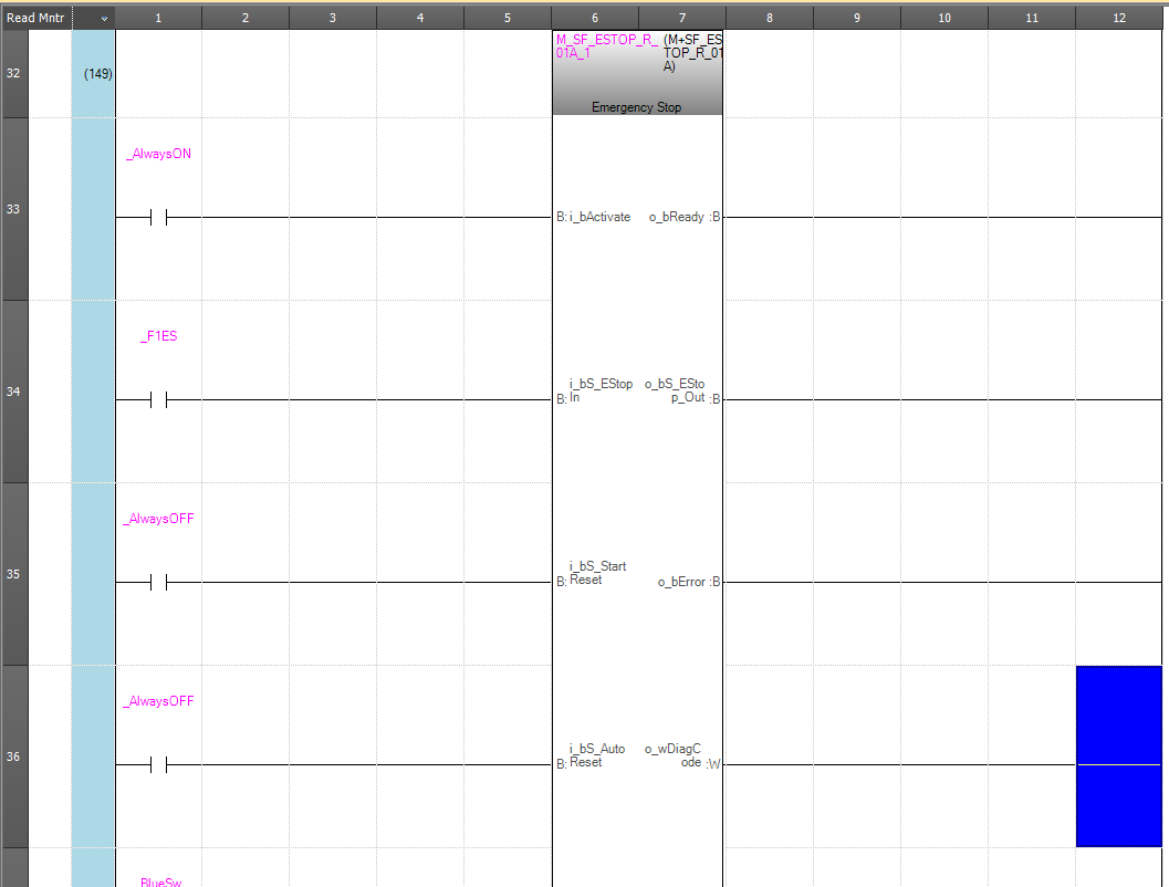 Rung32 uses Mitsubishi’s Safety Function Block to control the emergency stop.