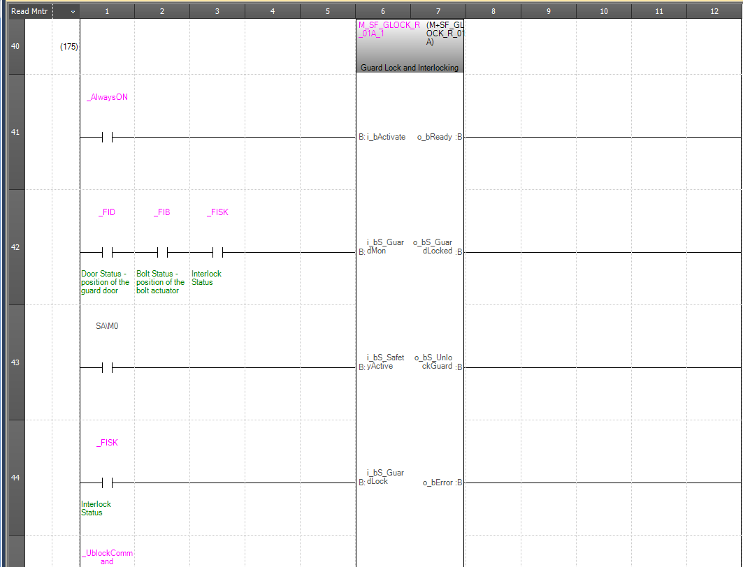 In Rung46, we use Mitsubishi’s Safety Function Block to control the door lock on the Euchner MGB-L2B-EIA-R-136508.