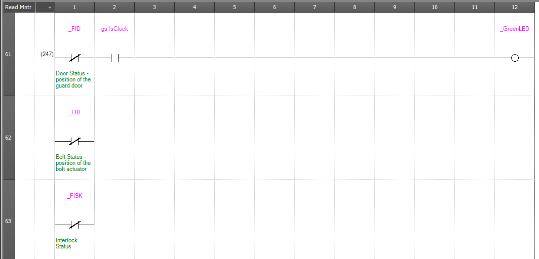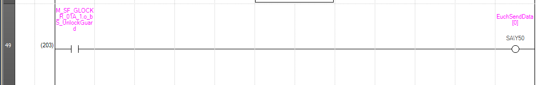 Rung49 unlocks the door lock based on the output from the previous Safety Function Block.