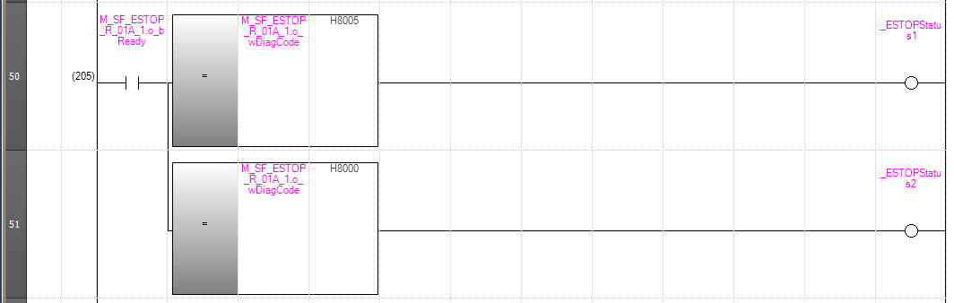 Rung50 checks the current status using the diagnostic words of the emergency stop Safety Function Block.