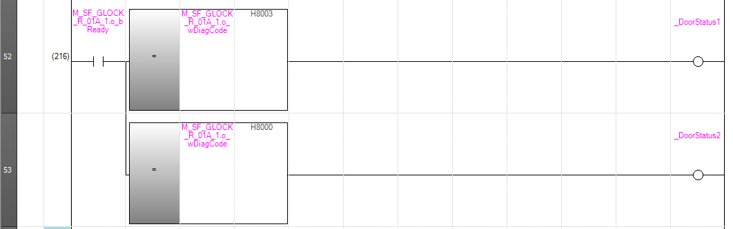Rung52 checks the current status using the diagnostic words in the door lock’s Safety Function Block.