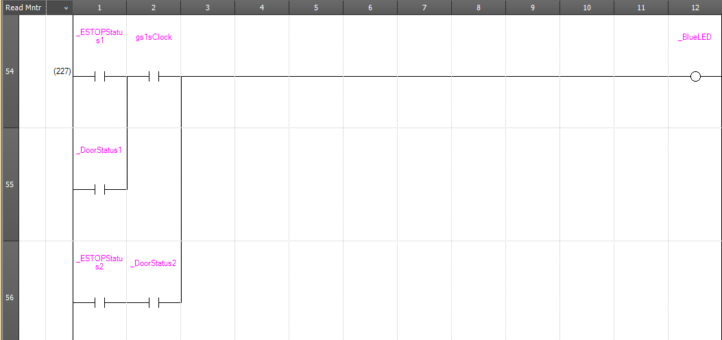 Depending on the status of the safety device, Rung54 outputs either a steady or flashing blue light.