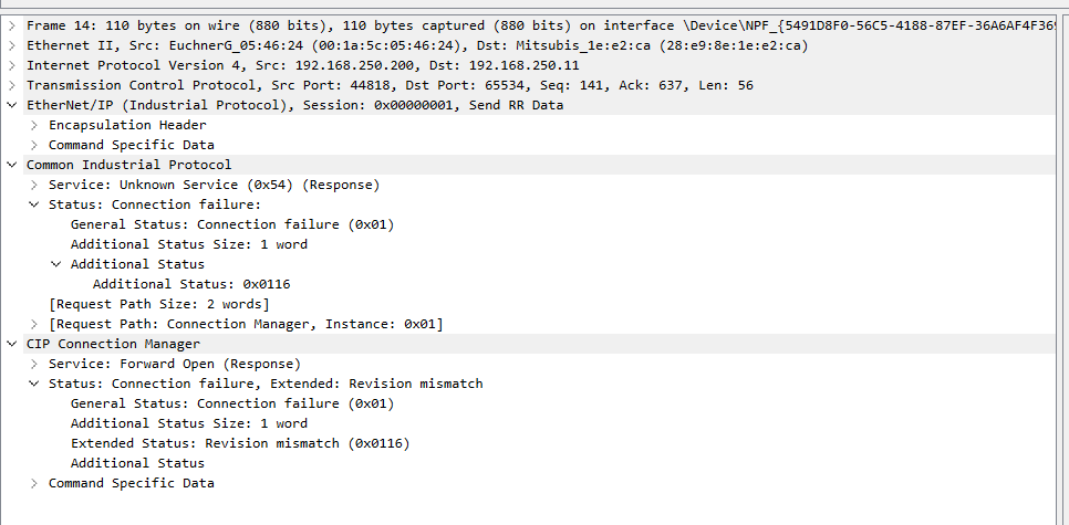 First, an error message was received from the CIP CM Protocol, and the connection cannot be established because the revisions do not match.