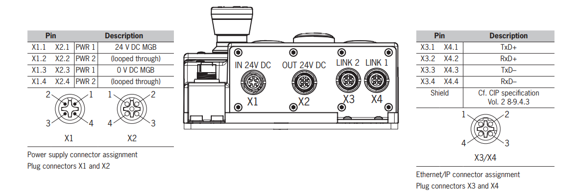 The bus module includes Ethernet/IP connections (X3 and X4) and power connections (X1 and X2). Connections are made using M12 plugs (Ethernet/IP M12 D-code, power M12 A-code). It also features an Ethernet/IP switch for Ethernet connections.