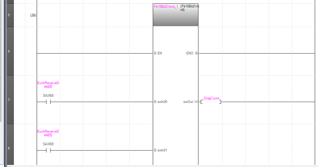 Rung 5 uses the 16-bit-to-Word conversion function block created earlier to retrieve the number of diagnostic events for the Euchner MGB-L2B-EIA-R-136508.