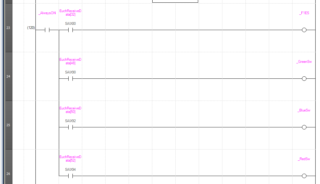 Rung23 retrieves the status of each button and the emergency stop status for the Euchner MGB-L2B-EIA-R-136508.