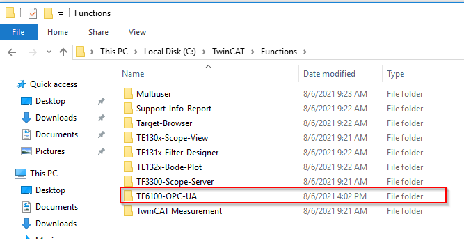 自分のPCにC:/TwinCAT/Functionsに、TF6100-OPC-UAというFolderが出てきます。