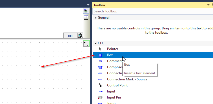 そうすると、右側にToolboxが表示され、CFC プログラムするに必要な部品が表示されます。