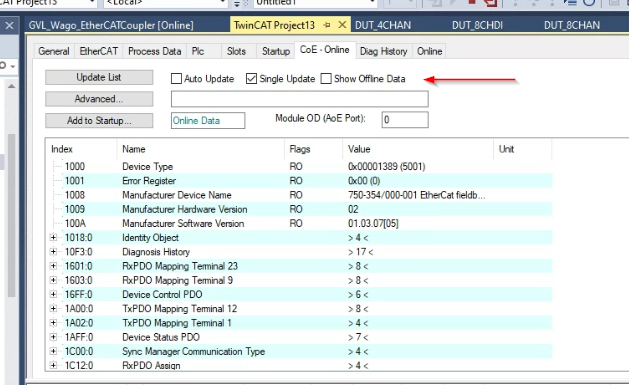 今回は実際接続してるEtherCAT Slaveの状態をみたいから、Show Offline DataのCheckboxを外してください。