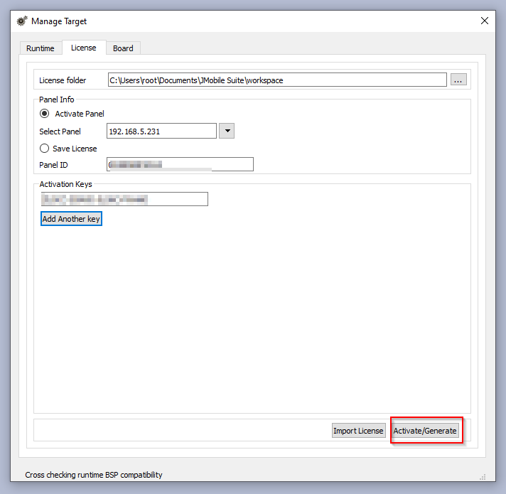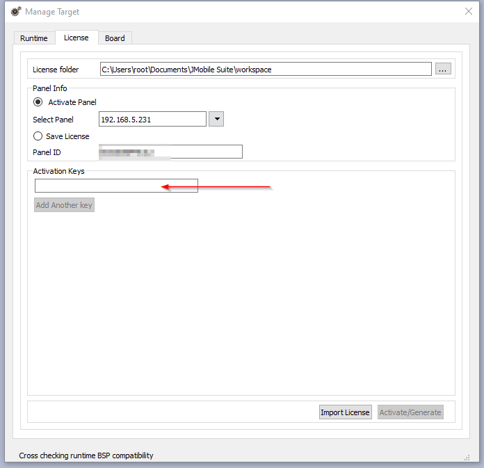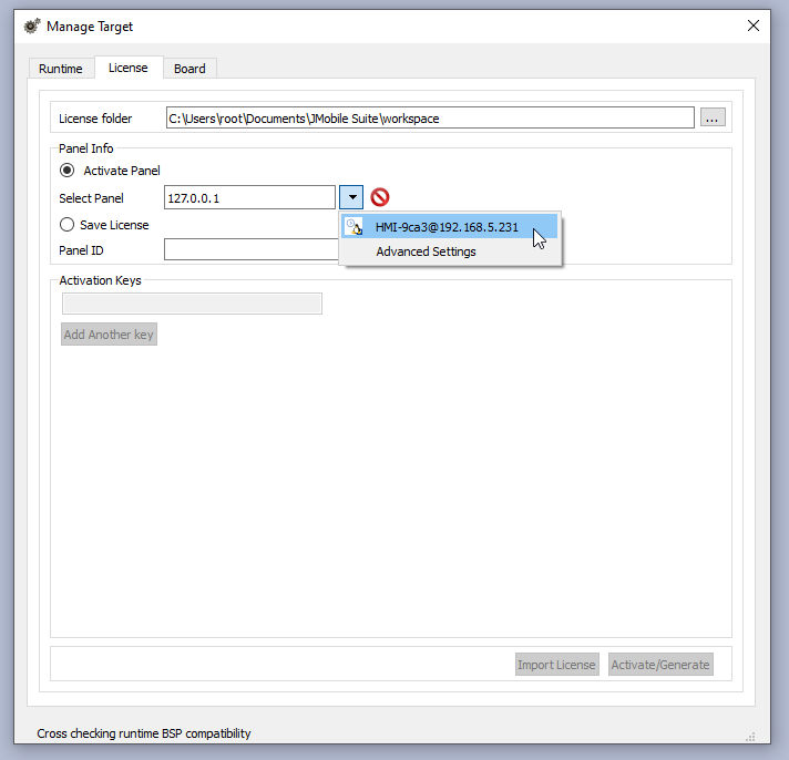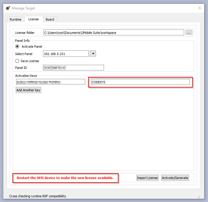 次はCodesysのライセンスを有効にします。License Tabを開き、Panel Info>Activate Panelを選び>Drop ListからJSMARTを選択していきましょう。
