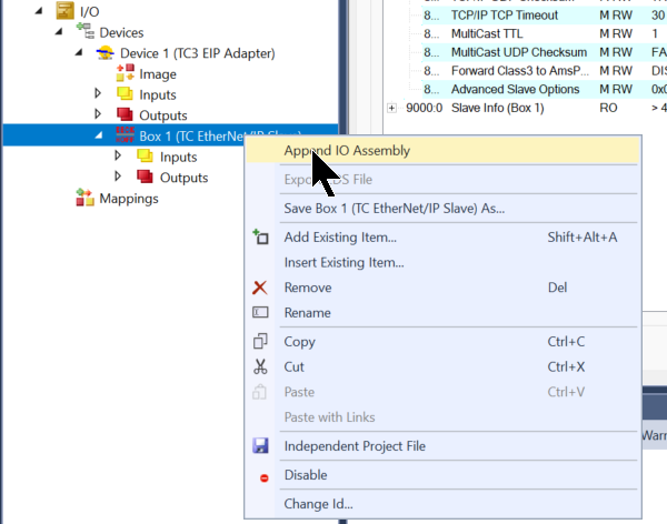 次あhEthernet/IP Adapter(Slave)を右クリック→Append IO Assemblyをクリックします。