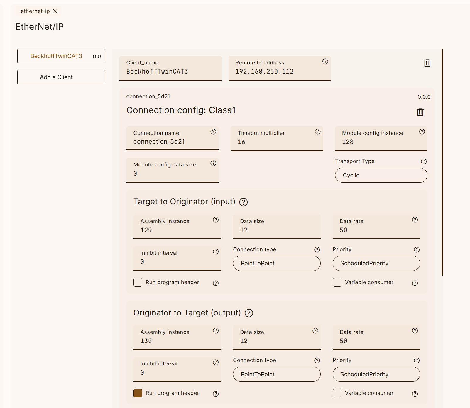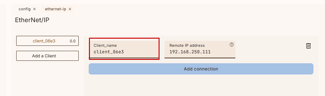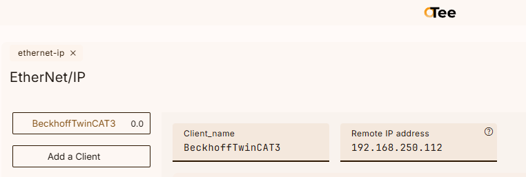 次はEthernet/IPの設定画面を開く、”Add a Client”で新しいEthernet/IP Adapterを追加します。