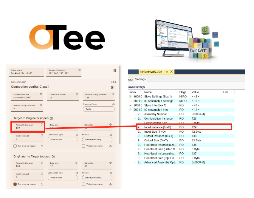 T→O Instance番号はTwinCAT3側のInput Instance(T→O)に合わせて設定します。今回の例では129になります。